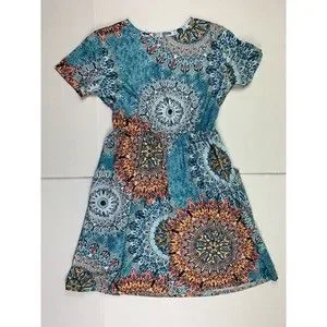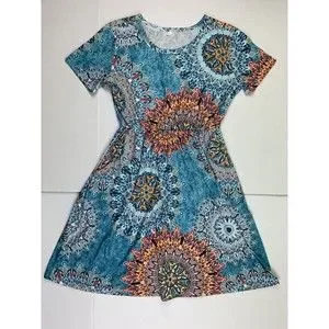 Women Dress Sz L Large Short Sleeve Pleated Pockets Stretch Elastic Waist Casual