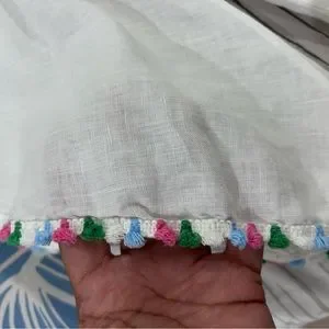 ZARA WOMAN • White linen Large Sleeve Blouse • sz Large • Gently Used • Great Condition • Off the Shoulders or On • Flowy Sleeves • Colorful Tassels • Fun / Cute •
