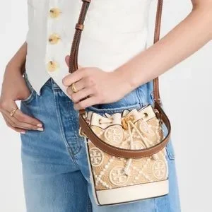 Tory Burch T Monogram Embroidered Raffia Mini Bucket Bag New Ivory
