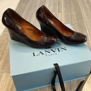 Lanvin Paris designer ballerina wedge in patent leopard dark purple , burgundy , prune color size 38 EU or 8 US. Used condition as shown. Wear on inside of soles as shown in provost. Comes with original Lanvin box and two Lanvin dust bags
