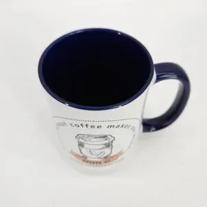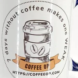 Coffee Op 15oz Coffee Cup White outside Navy blue inside and on the handle. Saying "7 days without coffee makes one WEAK" + Complimentary Gourmet coffee grounds - Your Perfect Caffeine Fix