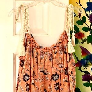 The gorgeous Cari Coverup Maxi Dress in Primrose by Ulla Johnson is perfect for warm days relaxing at the shore or strolling around the city. Made from a soft gauzy handloom fabric in a stunning vintage-inspired floral pattern, it is cut with a voluminous silhouette for comfortable wear. Featuring a ruffled scoop neckline in front & back, lowcut back, adjustable tassel shoulder ties, allover pleating & flounce hemline. Lightweight 55% cotton, 45% viscose, unlined. Approximate bust 25โ, length 53โ which can be made shorter or longer with the shoulder ties. NWT ๐ท