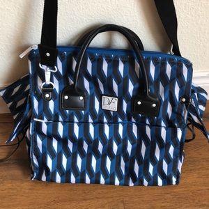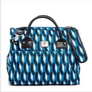 From DvF. Part of the Lilah luggage collection. Weekender box shaped bag with top zip closure that completely opens unzips. Blue white black geometric print. Removable shoulder strap with shoulder padding. Exterior front and back zipper pockets.Preowned in good condition with no stains or tears.