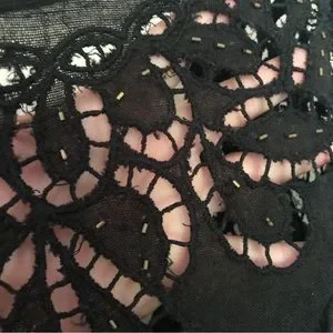 This top is gorgeous on!! It’s has petite mother of pearl buttons down the front, tiny brass beading throughout the cutout/embroidery detail and a generous swing cut. The top is a lightweight cotton linen. There are a few spots where the fabric is pulling from the embroidered cut outs, very hard to tell unless you’re looking for them. See photos.