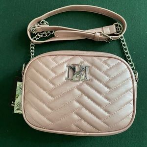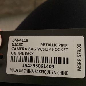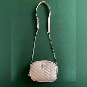Badgley Mischka Metallic Pink camera bag NWT. Slip pocket in back. Vegan leather. Adjustable chain crossbody strap. Interior has a zip pocket and slip pocket.