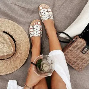 Rounded studs punctuate the straps of a cagey slide sandal with a lightly cushioned footbed.