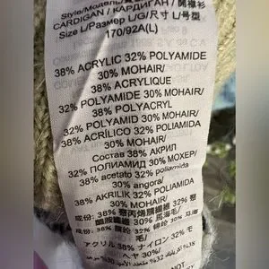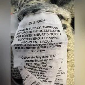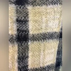 V-neck, long sleeves cardigan crafted of a brushed mohair blend. Plaid pattern in grey, cream, and moss yellow. Comes with extra Tory Burch button. Two lined pockets on both front sides. Amazing traditional high quality Tory Burch classic!
