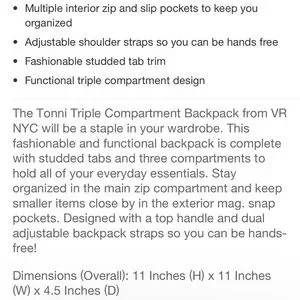 Super cute Tonni triple compartment backpack by violet ray. Please see photos for specs