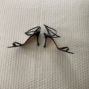 Black leather strappy sandal size 38. Approximately 2 1/2" heal. Gently worn.