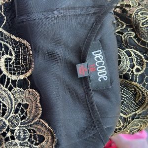 Above the knee black with gold lace. Full length black lining. Stunning, gorgeous, feminine beauty. Will take your breath away. You WILL be noticed wearing this beauty. Back zipper. Beautiful detail. This is definitely new but without tags.
