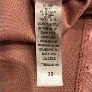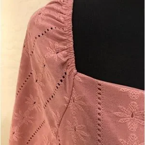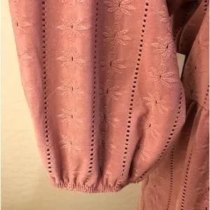 The dress is a dusty rose/mauve color, with elastic in the waist, neckline, and cuffs, a knot detail on the front, and eyelet details throughout. Fully lined apart from sleeves, heavier-weight material. Can be worn on or off-shoulder.
