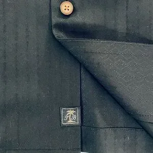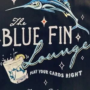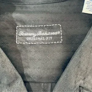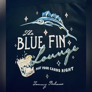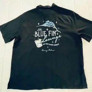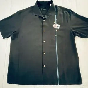 A 100% silk Tommy Bahama embroidered camp shirt : “”The Blue Fin Lounge”. All black material with a subtle pattern woven in. Coconut buttons, and a special “4 Aces “ embroidery down the left side for a nostalgic flair. A really intricate and colorful example of custom embroidery on the back, with the TB logo Marlin, cocktail and “Play Your Cards Right” in the mix. TB logo embroidered in collar and at front bottom of shirt, which is a men’s XL. In new condition ( from a large collection that I’m selling off)