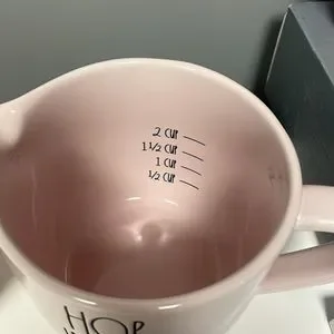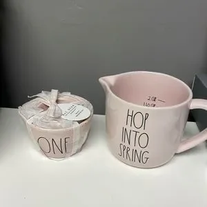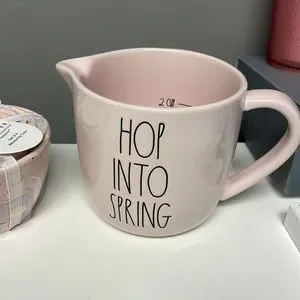 Rae Dunn speckled pink measuring cups and larger pink hop into spring measuring cup.