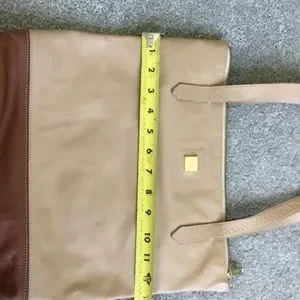 NELLY O “Leather” Purse Cream & Tan great fabric interior pinks/yellow/orange.