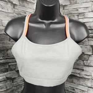 Adidas "All Me" sports bra from the Wanderlust Festival collaboration, featuring a heathered gray melange body with vibrant coral and gray crisscross back straps. This light-to-medium support bra is designed with a seamless, chafe-free construction and a wide ribbed under-bust band for a secure, stay-in-place fit. Crafted from moisture-wicking fabric with a breathable, open-back design, it’s perfect for yoga, studio sessions, or low-impact training.