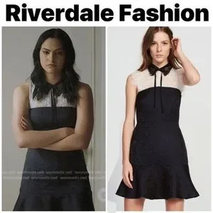 This is the โFlaviaโ navy blue, black and white brocade eyelash lace flounce mini dress by Sandro in designer size 0, which is equivalent to a US size ~00-XXS. This dress was seen on Veronica Lodge (played by Camila Mendes) on Riverdale. It is in excellent condition!