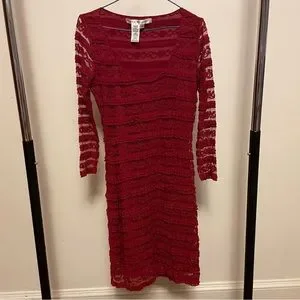 Red dress with sheer sleeves. Max Studio stretchy fitted dress with ruffled layers. U- neck and lined dress