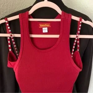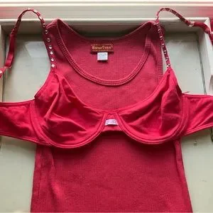 The fit a XS and S only. The tanks stretch and the bralette stretches because it’s made out of T-shirt material. All the other colors are coming as I’m washing them all today. No missing crystals off the bralette! It’s marked 34 C black teal, red coral