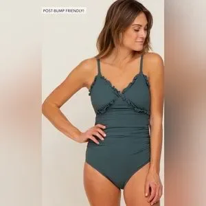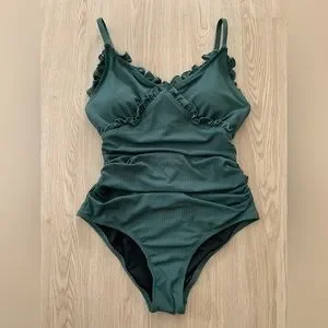 A ribbed one piece swimsuit featuring a ruffle v-neckline, side ruching, adjustable straps and a self-tie cutout back. Removable padding.