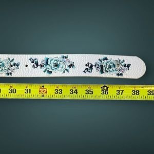This White House Black Market Womens White Leather Floral Embroidered Hip Fit Belt is a must- have for any fashion- savvy woman.