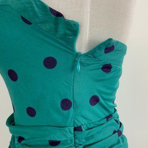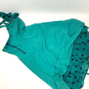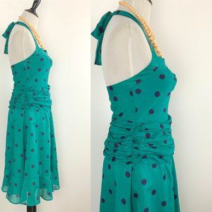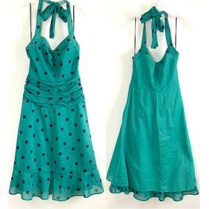 Marc Jacobs Retro Style Teal Polka Dot Ruched Halter Sun Dress. Halter top, fitted bodice, sweetheart neckline, flared skirt, ruched waist, side zip with hook & eye closure,