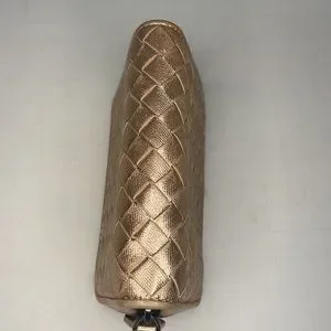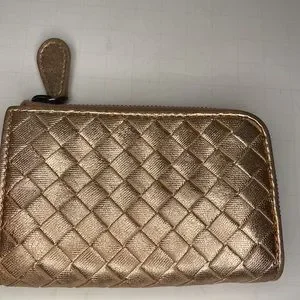 Authentic Bottega Veneta mini zippy rose gold leather wallet with box bag & COA in overall very good preowned condition. Super cute wallet still very shiny. Perfect for smaller summer bags. Does show discoloration along the edges but has a kind of washed Look to begin with so it’s not that noticeable. This item zips very well. In measures approximately 4 1/4 x 3”.