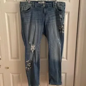 Torrid Floral Embroidered Boyfriend Cut Ripped Jeans, Size 18R, Floral embroidery under front pocket of right leg and bottom of pant on left leg. Super cute and great condition!