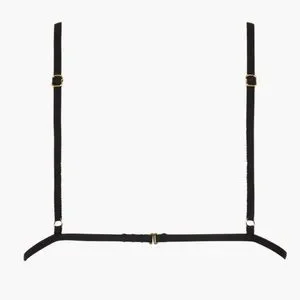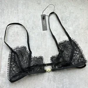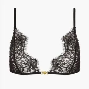The Roma Bralette in Nero by Sommer Sensual is a triangle lace bralette with unique gold embellishments at the centre. Features hand-cut scalloped trim lace, triangle style coverage, hook fastening at back and adjustable shoulder straps.