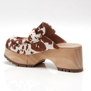 Features: Faux calf hair fabrication, loafer style uppers, stacked wooden clog sole, lugged outsole, lined footbed