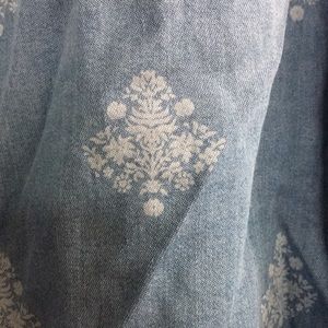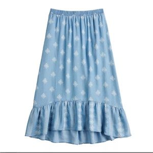 Skirt has elastic waist. It has pockets. Different print on bottom. High low cut. Could be a maxi/midi depending on height. Lauren lane x Sonoma.