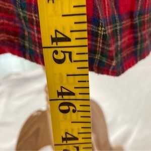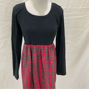 This dress has a top with stretch made is a t shirt line material with the bottom being flannel in red plaid. There are signs of wear as shown in the pics. The back has a lower neckline than the front.
