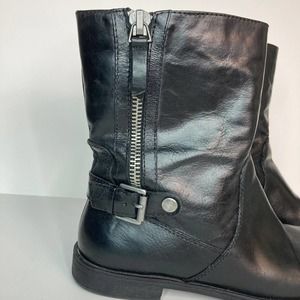Nine West Black Leather Moto Style Biker Boots Women's Size 8M Buckle Zipper. Pull on style zipper closure leather boots by Nine West. Biker style moto boot. Mid calf, low heel. Slightly slouchy. Style # NW7MYCHOICFF. Leather upper, balance man made size 8M. Exposed zipper detail on outer ankle above a buckle strap embellishment. In great, pre-owned condition. There is some peeling and cracking to the upper interior manmade faux leather lining material at the inner top of the shaft that is not seen on the outside of the boot at all when worn. Leather is in great condition and the soles have very little wear. Please see photos. Original box not included.