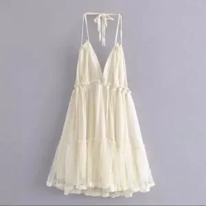 SOLD OUT Ivory Swiss Dot Mesh Boho Halter Mini Dress