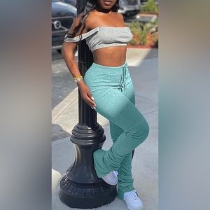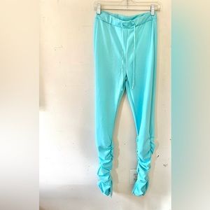 A super casual yet stylish pair of trendy stacked pants in mermaid turquoise blue color way. Stretchy material with drawstring at the hem.