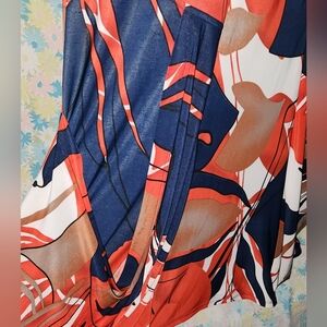 This slinky, poly-knit abstract print vintage dress is amazing! It has the coolest, balloon-y, super deep side pockets! This has no tags. It has a couple very minor snags in the fabric, see photos. There's a photo attempting to look inside the pocket, too show how deep they are.