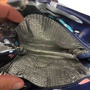 This new lunch box / tote is so cute. It is insulated but there are no inside dividers or pockets. There is one pocket on the outside. Dimensions are approximately 8 in. X 9 in. X 5 in. I like how flat it folds to when empty. It wont take up much cabinet space.