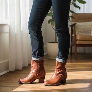 Frye Lucinda Scrunch Real Cognac Brown Leather Stretchy Heeled Short Ankle Boot