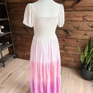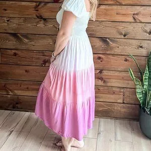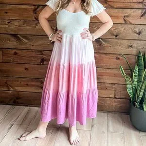 HALF SLEEVE WOVEN OMBRE TIERED MIDI DRESS, LINED FROM WAIST TO KNEE