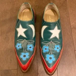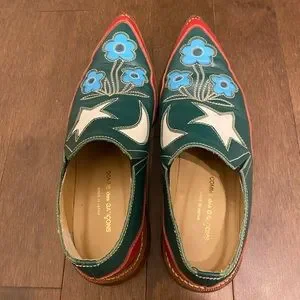 Comme des Garçons floral/stars/moons cowboy loafers from the Fall 1999 runway show