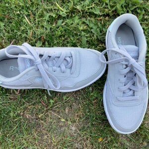 These Unisex Reebok Royal Techque sneakers (style #EG4580) are great for both women and men. They are practically new. I only wore them once. Size 5.5. They're gorgeous in the gray/white color with a light blue Reebok logo on the back.