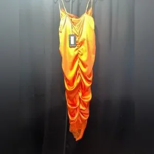 Orange Satin Plunge Ruched Midaxi Dress NWT