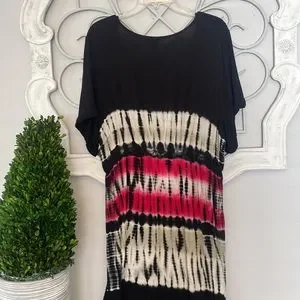 This super comfortable,stretchy knit tie dye dress would be great to wear with sandals or as a beach coverup .