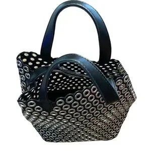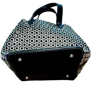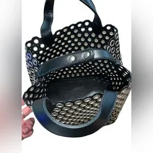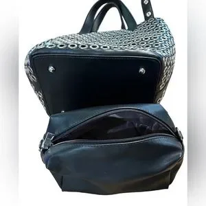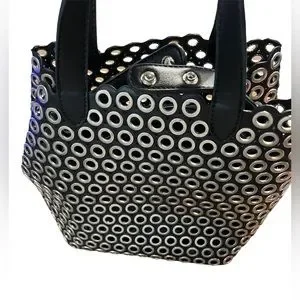 Biker style no name black & silver tote & removable insert. NWOT. This alluring tote bag for women has been designed to assist you on any day. Convenient to carry and fashionably designed, the tote is cut with skill and sewn into a great shape. It is well-equipped to be a reliable accessory. Bag is approximately 8.5” W, 9” H & 6.5” D. Drop from handle to bag is about 4”, making it extremely comfortable to carry. Black solid insert zips for security. Bag was clearly inspired by Miu Miu’s Black Leather Grommet Biker Tote, but this bag is NOT marked w any designer name (which is too bad as they deserve credit for crafting such a high quality purse—the leather is stunning). #designerInspired #BikerBag #ToteBag #LeatherTote #SmallToteBag
