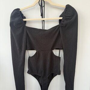 The Dionne Bodysuit features a sweetheart neckline with a tying halter string accent. Ruched bust leads to side cutouts. Long sleeves with puff shoulders. Attached thong bottoms have snap button closures.