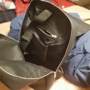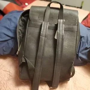 Artelusa men's backpack/computer bag. Black in color amd made from Portuguese cork. It has a strap to hold your computer or tablet. Pocket foe your phone and 2 zipper pockets for other items that you don't want moving around.