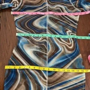 Vtg 90s Y2k Mesh Dress S M Bodycon Swirl Sheer Stretch Blue Brown Rave Club
