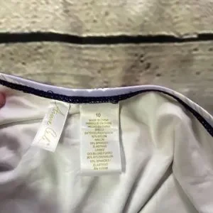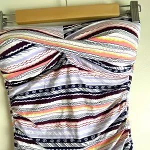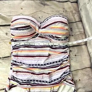 Anne Cole teal twist front ruched strapless swimsuit in size 10. Sweetheart bandeau neckline, pull on, moderate bottom coverage, ruched sides, modesty padding. No straps, nylon, spandex. Excellent condition. Navy photos are to show fit.