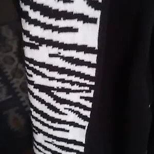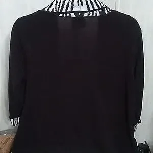 Like New beautiful Black Lsrge Jacket/Cardigan . Has med sleeves With Zebra trim around the wrist. Has no buttons open front.