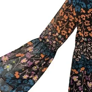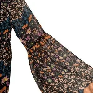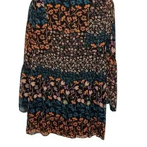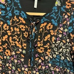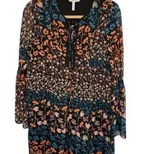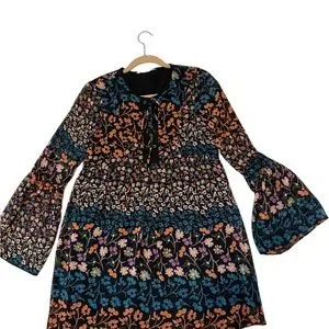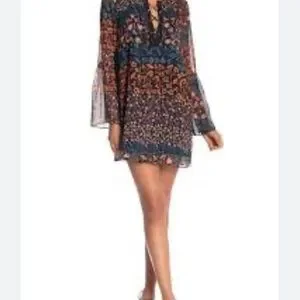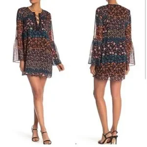 New with tags front lace up print dress from BCBGeneration. Boho style dress with bell see thru sleeves. Floral print with metallic threads. Babydoll silhouette. Fully lined. 100% polyester.
