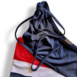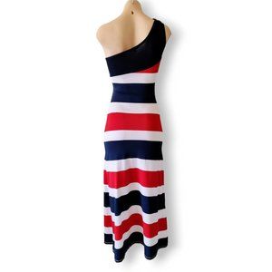 Y2k, dark blue, red + white one-shoulder maxi dress XS fits AU 4, 6, 8